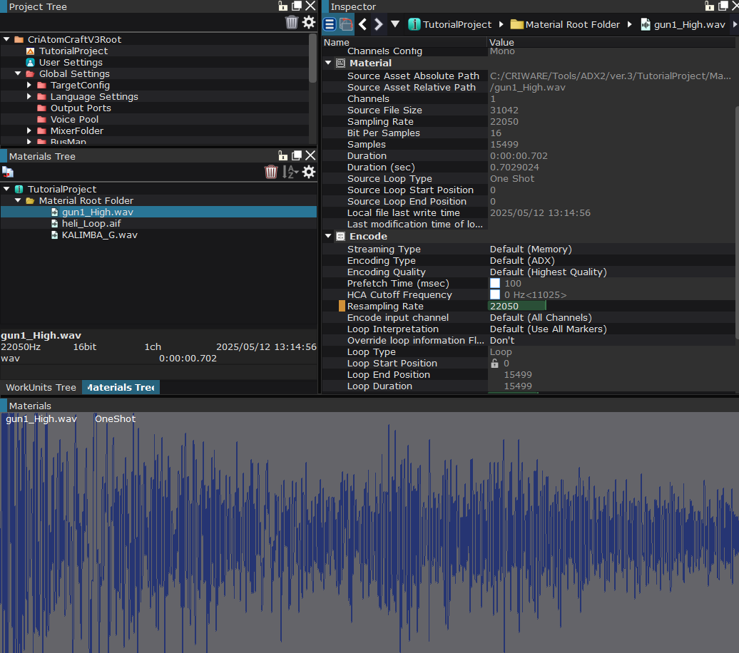 This is the name of an audio file (it can be a .wav or an .aiff file) that has been registered in Atom Craft. It contains file information, as well as looping and encoding settings, etc. Materials can be organized in Material Folders folder and inherit the parent settings to simplify the setup.