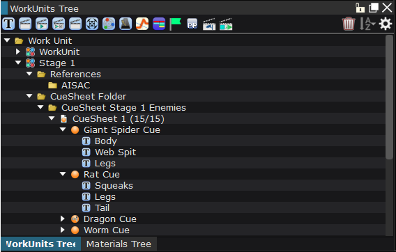 A Work Unit can contain one of more Cue Sheets. Cues Sheets are containers for Cues. A Cue basically corresponds to an interactive sound, and therefore, the Cue Sheets are similar to the sound banks one can find in other middleware.