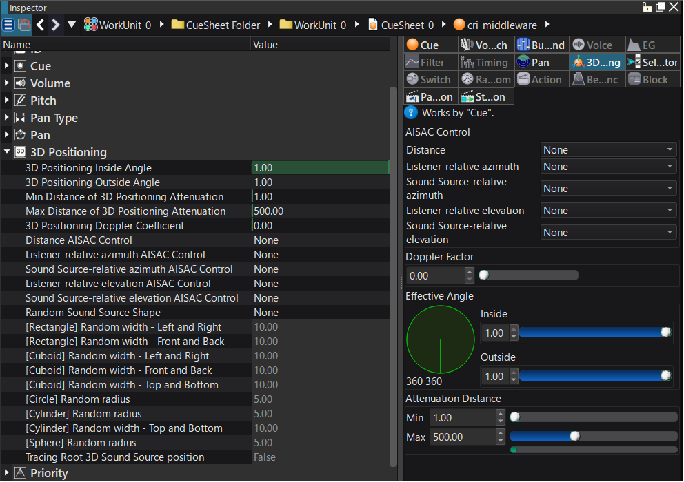 3D audio positioning requires the programmer to set and update the positions of sound emitters and listeners in the 3D space of the game. By creating AISAC controls that correspond to the distance and angle from the sound emitters, it is possible to create richer 3D spatial tonal changes that match each Cue’s unique distance attenuation and angle changes.