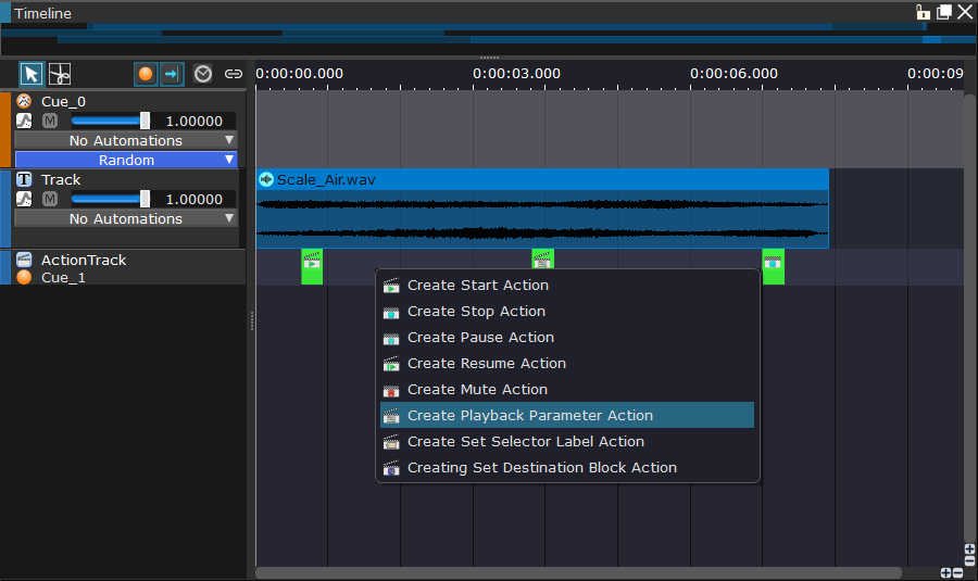 These are special tracks with markers on them that will trigger specific Actions when the playback reaches them. Various actions are available, allowing you to start, stop, pause, or update the parameters of other Cues, for example. This makes it possible for a sound designer to create complex sonic behaviors without the help of an audio programmer.