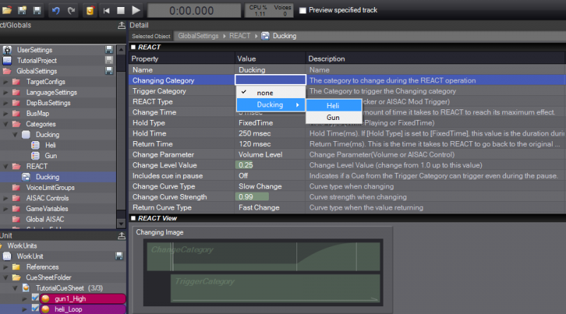 REACT is an automatic ducking system for Cues belonging to a specific category. For example, you can configure it so that the volumes of all the Cues from the SFX and Music categories are automatically lowered when a Cue from the Dialogue category is triggered, thus ensuring that the dialogue is always intelligible and no information is missed by the player.