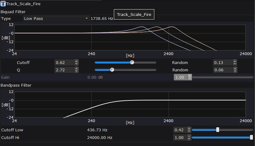 The first filter is a general Biquad that can be set to lowpass, highpass, notch, low shelf, high shelf, or peaking modes, or simply disabled. Some randomization can be applied, so that the filter’s frequency response curve is not always the same.