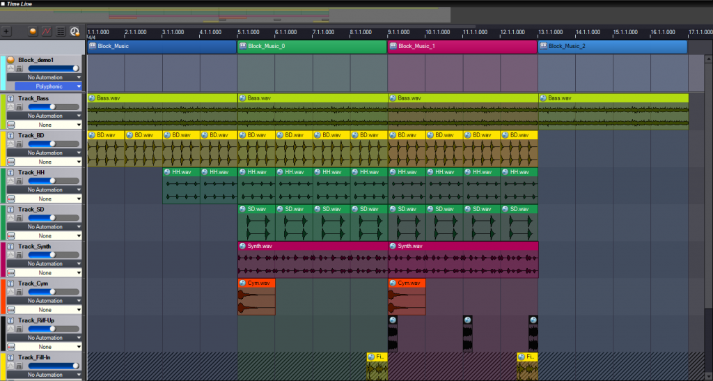 Blocks are used to divide the timeline of a Cue into different sections (therefore, a block references the data of several tracks). Transition rules between the blocks (synchronization, transition division number, etc.) can be designed using the tool. Block Playback is especially useful for interactive music implementation.