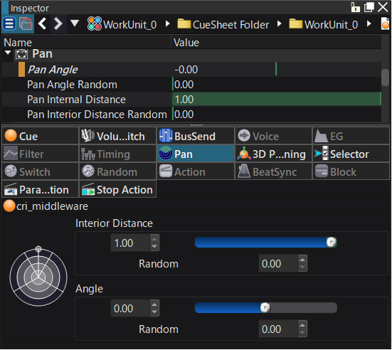 Pan 3D is a function that calculates the sound positioning in a multi-speaker environment (stereo, 5.1ch, 7.1ch, 7.1.4ch, etc.) based on Cue parameters such as angle and interior distance.