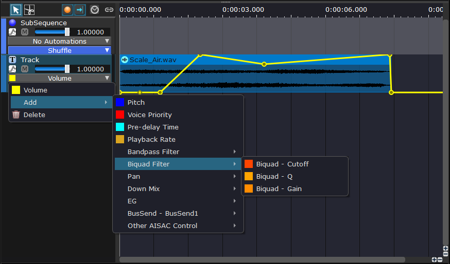 This system allows for the modification of sound parameters in real-time, usually from values coming from the game. AISAC stands for Advanced Interactive Sound and Active Controller. This is equivalent to RTPC (Real-Time Parameter Control) in other tools.