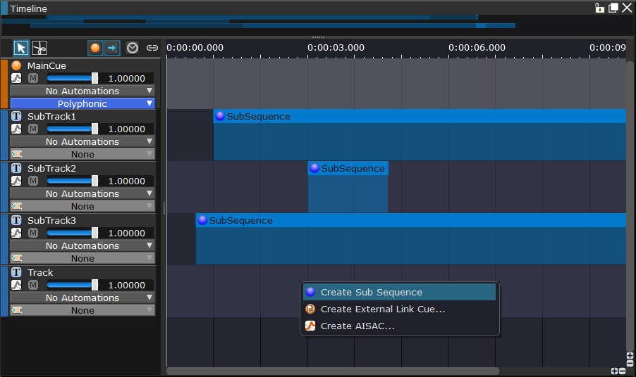 This is another way to create complex Cues while keeping them readable. It is possible to add a SubSequence to a Track. SubSequences can contain several Tracks and can have the same types as Cues. In addition, their Tracks can have their own SubSequences, allowing for several levels of nesting. Unlike with Cue Links, which are simply references to external Cue data, the SubSequence tracks are actually part of the Cue.