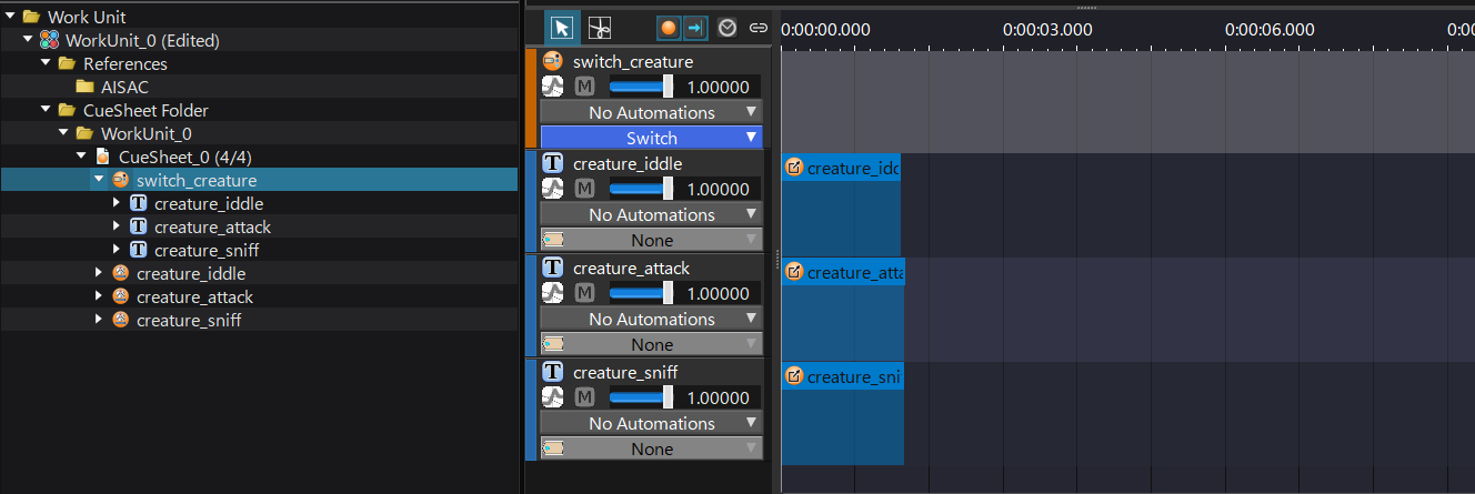 After importing the sound assets into the Material root folder, we create three Random No Repeat Cues, one for each creature state. We assign the sounds we designed for each state to the corresponding Cue, ensuring that there is a single Material per Track. The Cue’s built-in randomization mechanism will make sure that the same Track is never played twice in a row, adding more realism.