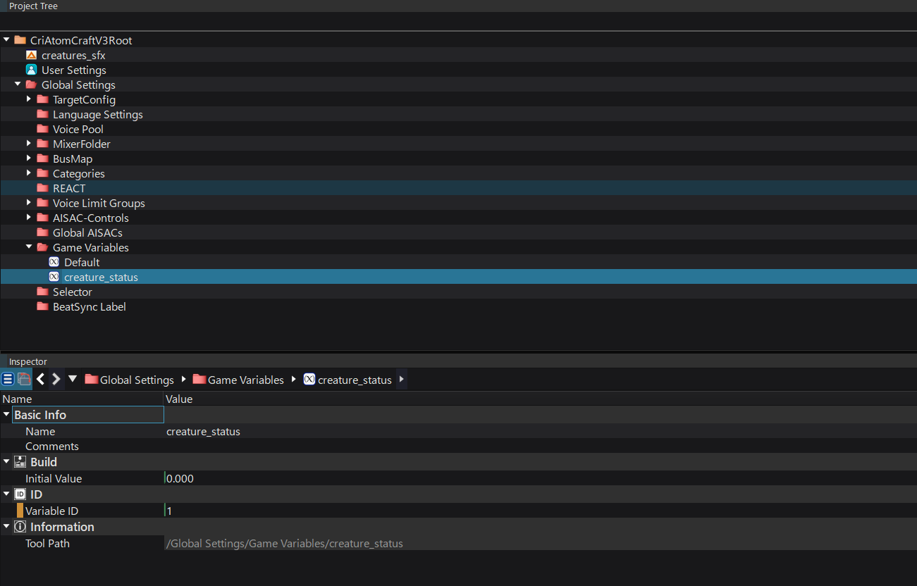 At this stage, our sounds are ready to be played, but we still need the system to listen to the game engine. In the Project Tree, under the Game Variables folder, we create a new variable called “creature_status”. (Note that for well defined states, the usual way to do this would be to create a Selector and Selector Labels, but we want to show here that it is also possible with a Game Variable.)
