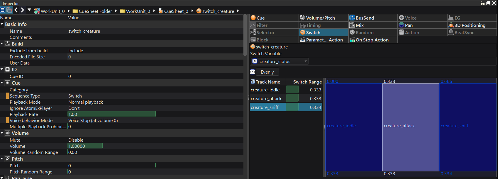 In the Switch Cue‘s inspector, we assign the newly created game parameter to the Switch Variable. Then, we can adjust the value ranges that will trigger the different types of sound effects. You can also simply click the “Evenly” button to distribute the values equally between each Track (in our case 0.333 for each Track), and adjust them later if necessary.